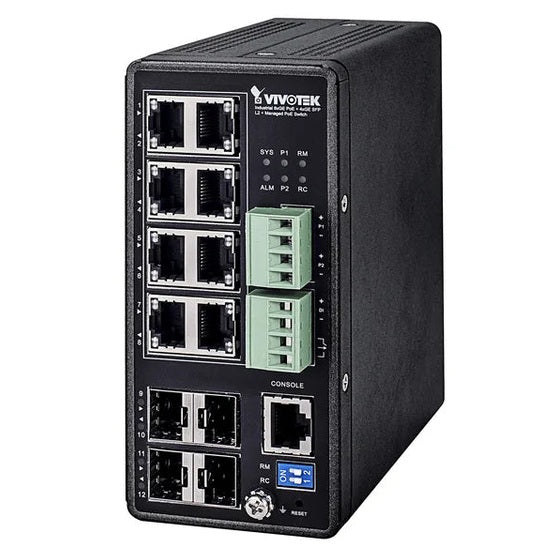 VIVOTEK AW-IHT-1271. Switch type: Managed, Switch layer: L2+. Basic switching RJ-45 Ethernet ports type: Gigabit Ethernet (10/100/1000), Basic switching RJ-45 Ethernet ports quantity: 8, Installed SFP modules quantity: 4, Console port: RJ-45. MAC address table: 8000 entries, Switching capacity: 24 Gbit/s. Networking standards: IEEE 802.1D,IEEE 802.1Q,IEEE 802.1s,IEEE 802.1v,IEEE 802.3,IEEE 802.3ab,IEEE 802.3ad,IEEE.... DC input voltage: 48 - 57 V. Power over Ethernet (PoE)