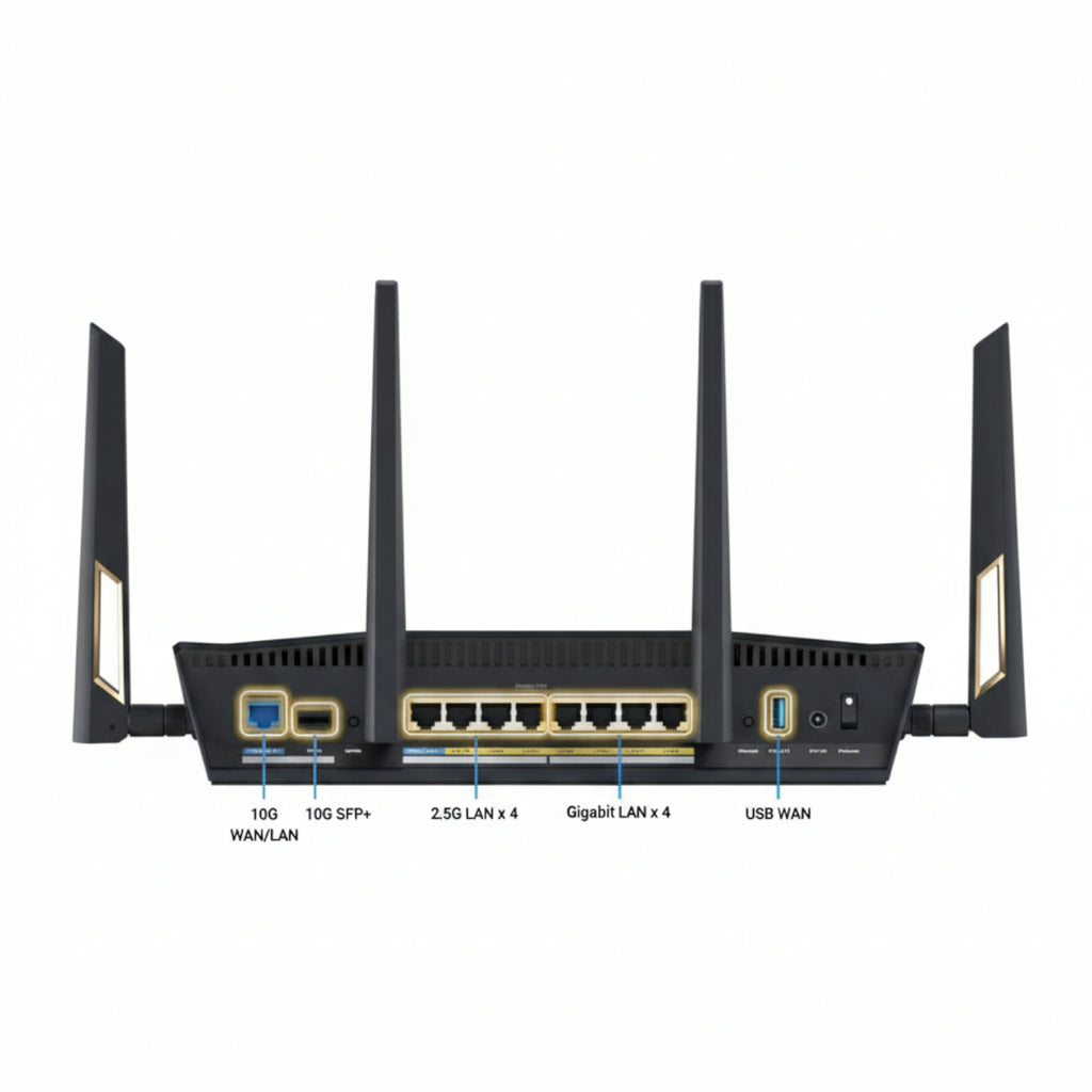 Beyond its wireless capabilities, the RT-BE88U boasts exceptional wired connectivity. It features a 10 Gigabit WAN port and a 2.5 Gigabit WAN/LAN port, providing ultra-fast internet access for fibre optic connections and the ability to connect high-bandwidth devices such as NAS systems, gaming PCs, or workstations. With multiple Ethernet ports, you can easily create a high-speed wired network for critical devices, ensuring maximum data transfer speeds and minimal latency. This makes it an ideal choice for small offices, studios, or homes where wired performance is paramount, complementing its high-speed router capabilities.