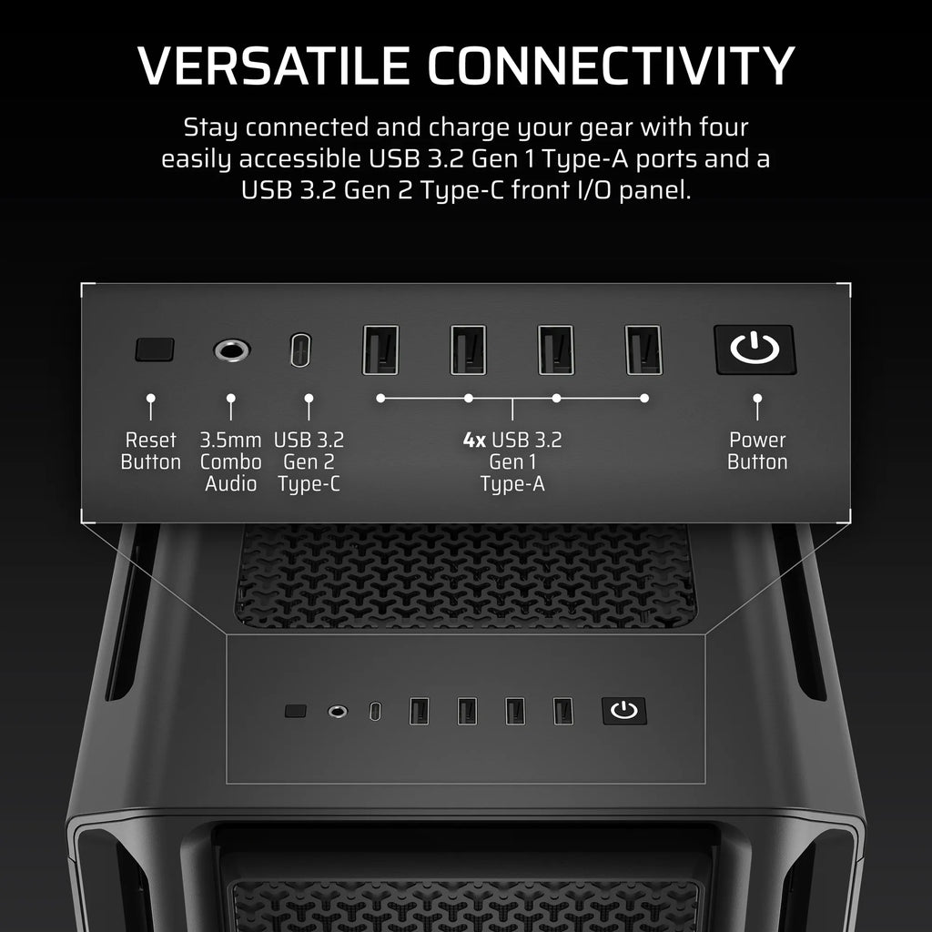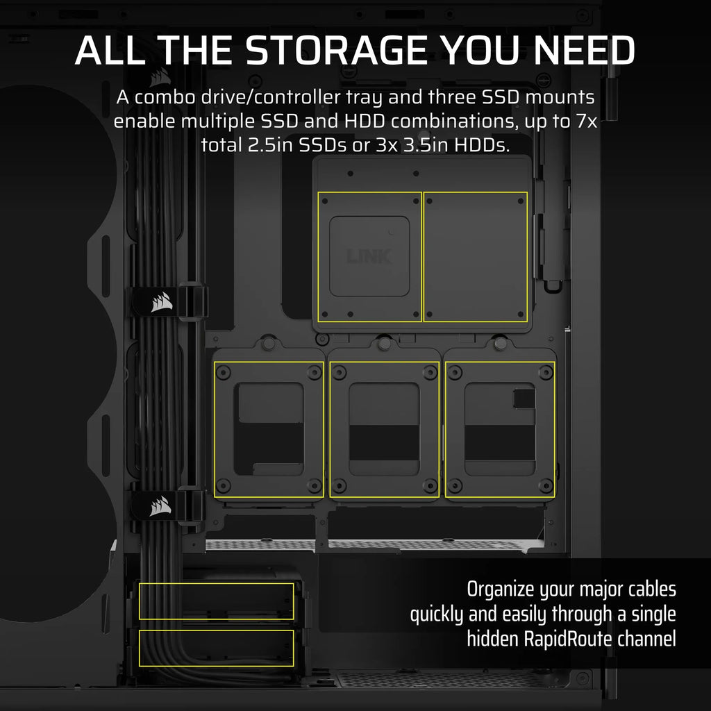 Corsair 5000T. Form factor: Midi Tower, Type: PC, Product colour: Black. Supported power supply form factors: ATX. Front fans diameters supported: 120,140 mm, Side fans diameters supported: 120 mm, Rear fans diameters supported: 120 mm. Supported HDD sizes: 3.5", SSD form factor: 2.5". Width: 255 mm, Depth: 545 mm, Height: 550 mm