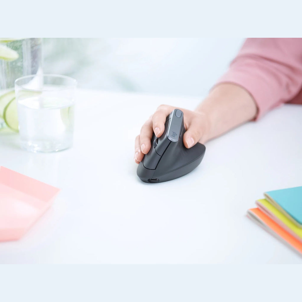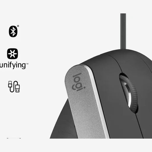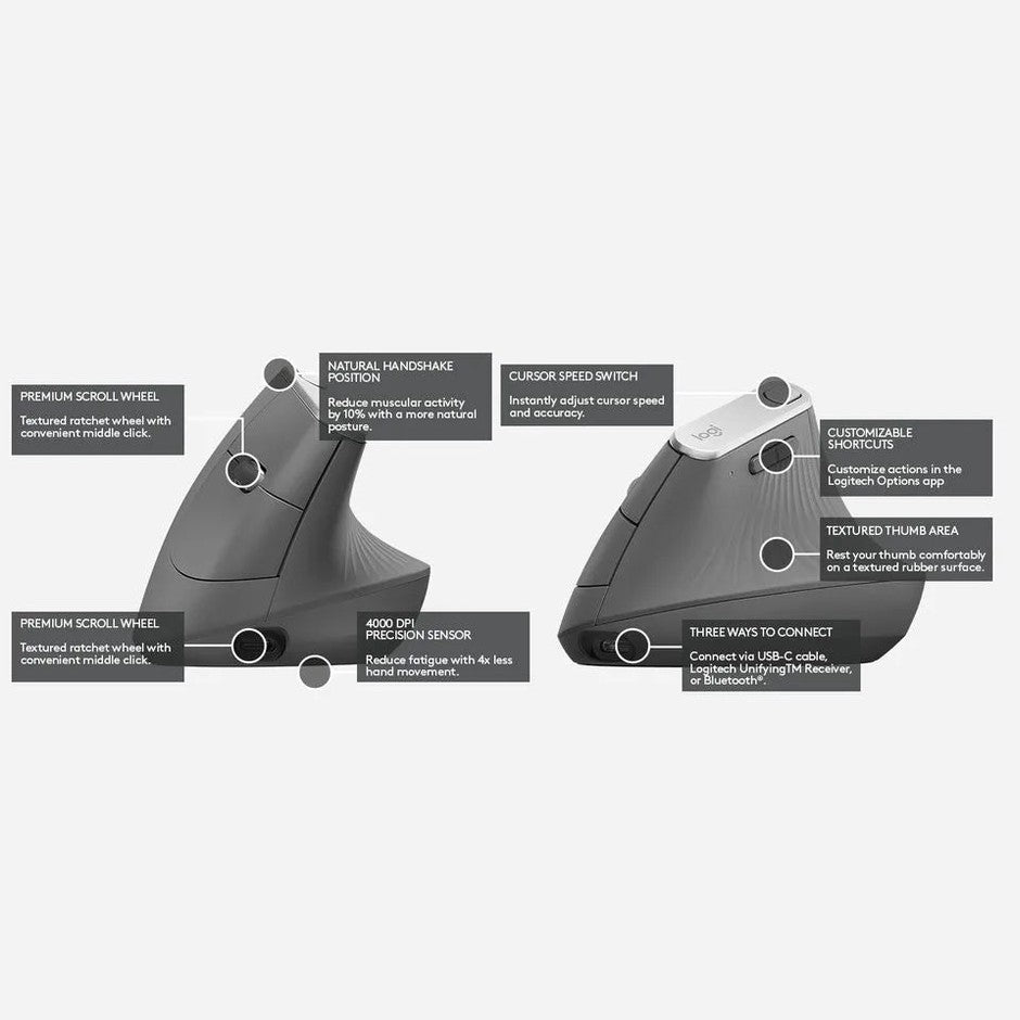 Logitech MX Vertical Advanced Ergonimic. Form factor: Right-hand. Movement detection technology: Optical, Device interface: RF Wireless+Bluetooth, Movement resolution: 4000 DPI, Buttons type: Pressed buttons, Scroll type: Wheel. Power source: Cable. Product colour: Black