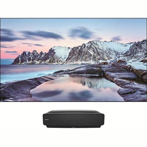 Hisense 80 inch 4K Ultra High Definition Laser HDR VIDAA Smart TV- X Fusion Technology DLP Front Projector and Screen, Resolution 3840 × 2160, Aspect Ratio 16:9, Dynamic Contrast Ratio 2000:1, MTK Quad Core Processor, Digital DVB-T2 TV Tuner, VIDAA U2 User Interface, Opera V4.9 Web Browser, Built-in Wi-Fi 802.11 ac/b/g/n, Bluetooth Connectivity, Ethernet Lan RJ45 Port,4 x HDMI Ports, 2x USB Ports, 1x VGA D-SUB Input Port, 1x Optical Output, 1x RCA Output Port, Miracast, Dolby Audio, Stereo 15W x 2 Sound Output Power Wall-Mount Projector Screen, Retail Box , 3 year Limited Warranty