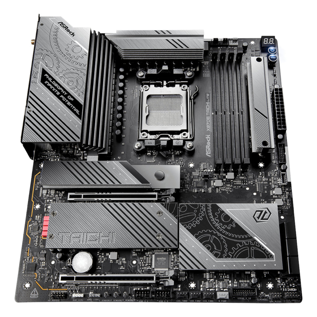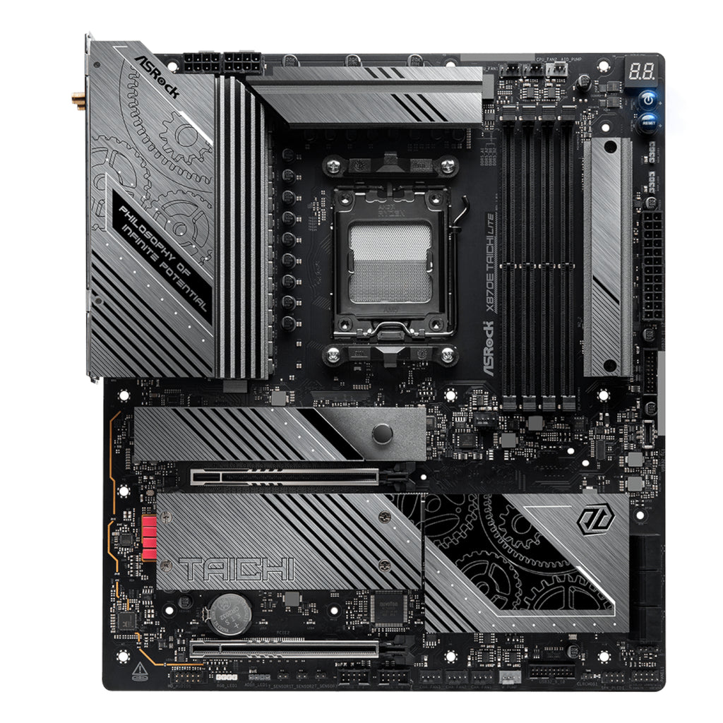 Harness the power of true adaptability and unmatched performance with the ASRock X870E Taichi Lite AM5 ATX Motherboard, where minimalist design meets maximum capability. Inspired by the philosophy of boundless potential, the Taichi Lite is engineered to be as fluid and adaptable as water—ready to evolve with the needs of high-performance gamers, creators, and professionals alike. Supporting AMD Ryzen™ 9000, 8000, and 7000 Series processors with the latest AMD X870E chipset, this motherboard provides top-tier specs including dual PCIe 5.0 x16 slots, DDR5 memory overclocking up to 8200+ MHz, and blazing-fast USB4 Type-C connectivity. Whether you're building a next-gen gaming powerhouse or a productivity-driven workstation, the Taichi Lite delivers unwavering stability and responsiveness.