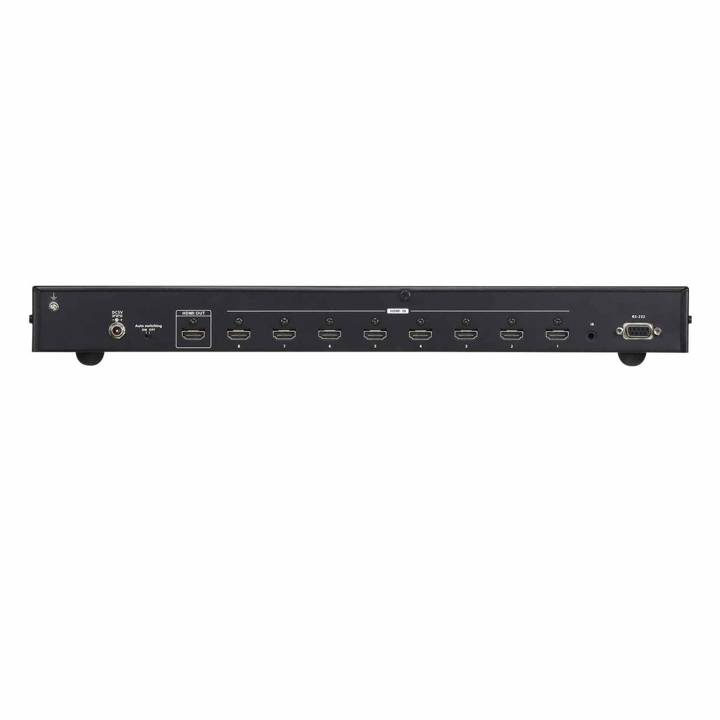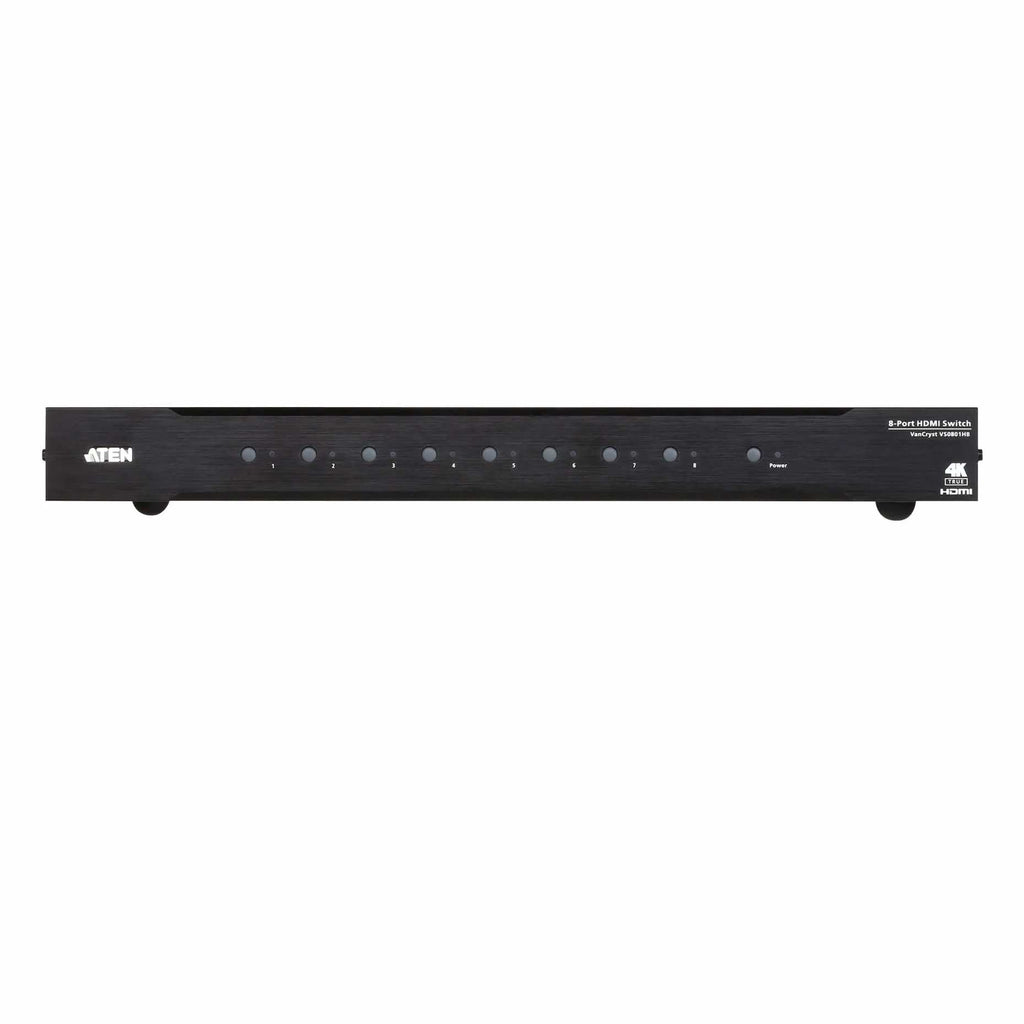 ATEN VS0801HB. Video port type: HDMI, Video in: 8 x HDMI Type A Female (Black), Video out: 1 x HDMI Type A Female (Black). Product colour: Black, Material: Metal, Maximum refresh rate: 60 Hz. AC adapter input voltage: 5.3 V, Power consumption (typical): 3.73 W. Width: 158.3 mm, Depth: 437.2 mm, Height: 44 mm