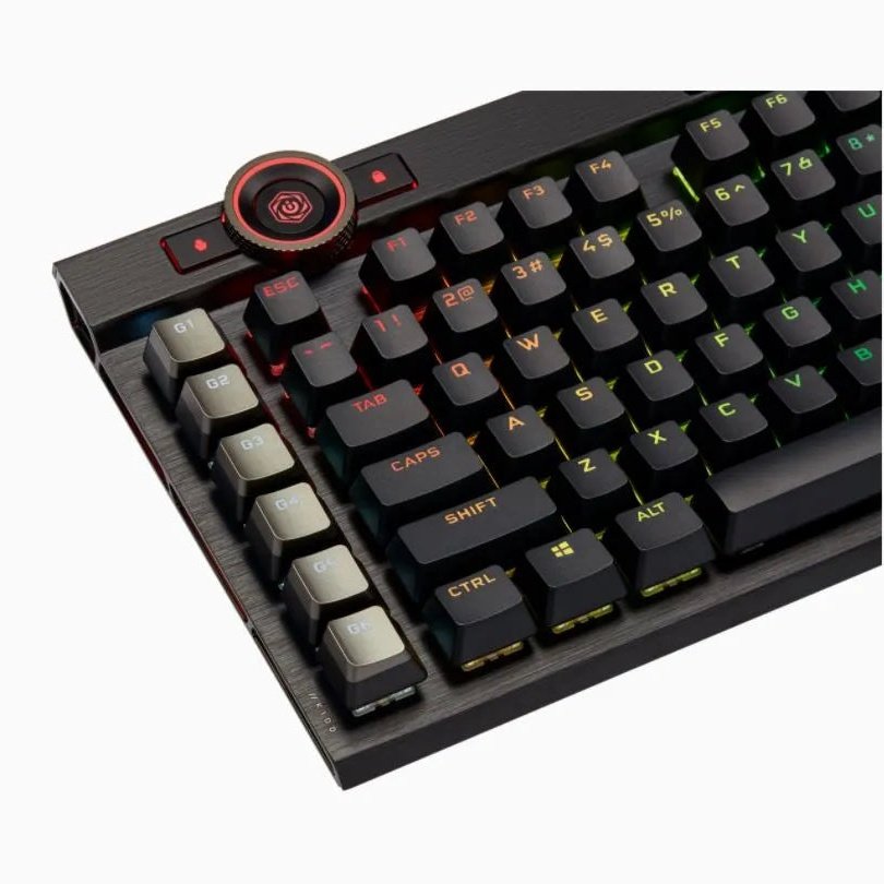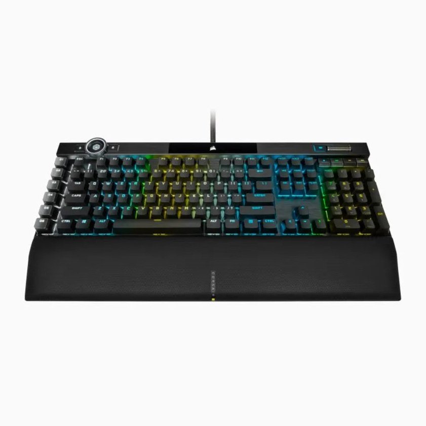 Corsair K100 RGB. Keyboard form factor: Standard. Keyboard style: Straight. Device interface: USB, Keyboard key switch: Mechanical, Keyboard layout: QWERTZ, Keyboard number of keys: 110. Backlight type: RGB LED, Wrist rest. USB hub, Recommended usage: Gaming. Product colour: Black