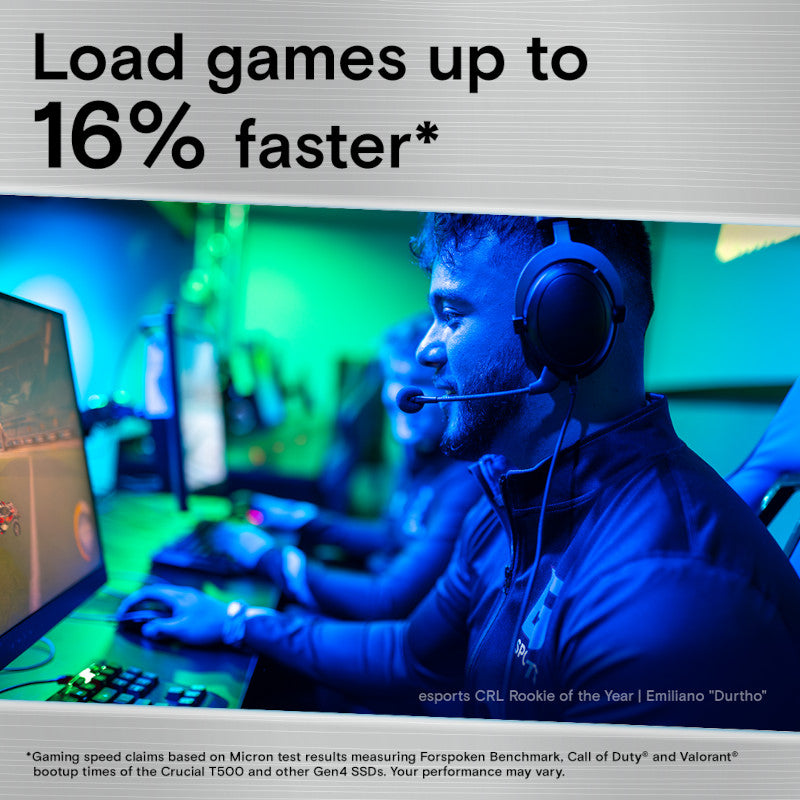 The Crucial T500 PCIe® Gen4 NVMe SSD will improve your gaming and content creation experience. The T500 is a game changer, designed for high-performance gaming, PS5 upgrades, and photo/video editing. With sequential read/write speeds of up to 7,400/7,000MB/s and random read/write speeds of up to 1.44M IOPs, you'll be able to load games 16% faster and enjoy a 42% increase in content creation app performance.