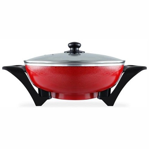 Mellerware Electric Bangkok Wok- 33x9cm 1500w Tempered Glass Lid With Steam Vent Die Cast Aluminium Finish High Quality Non-Stick Coating Cool Touch Handles Includes Steam And Drip Rack Colour Red 1 Year Warranty