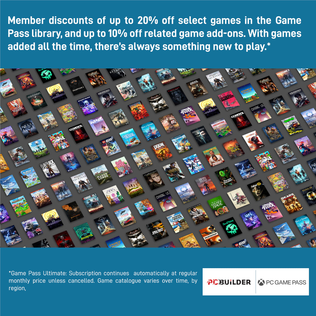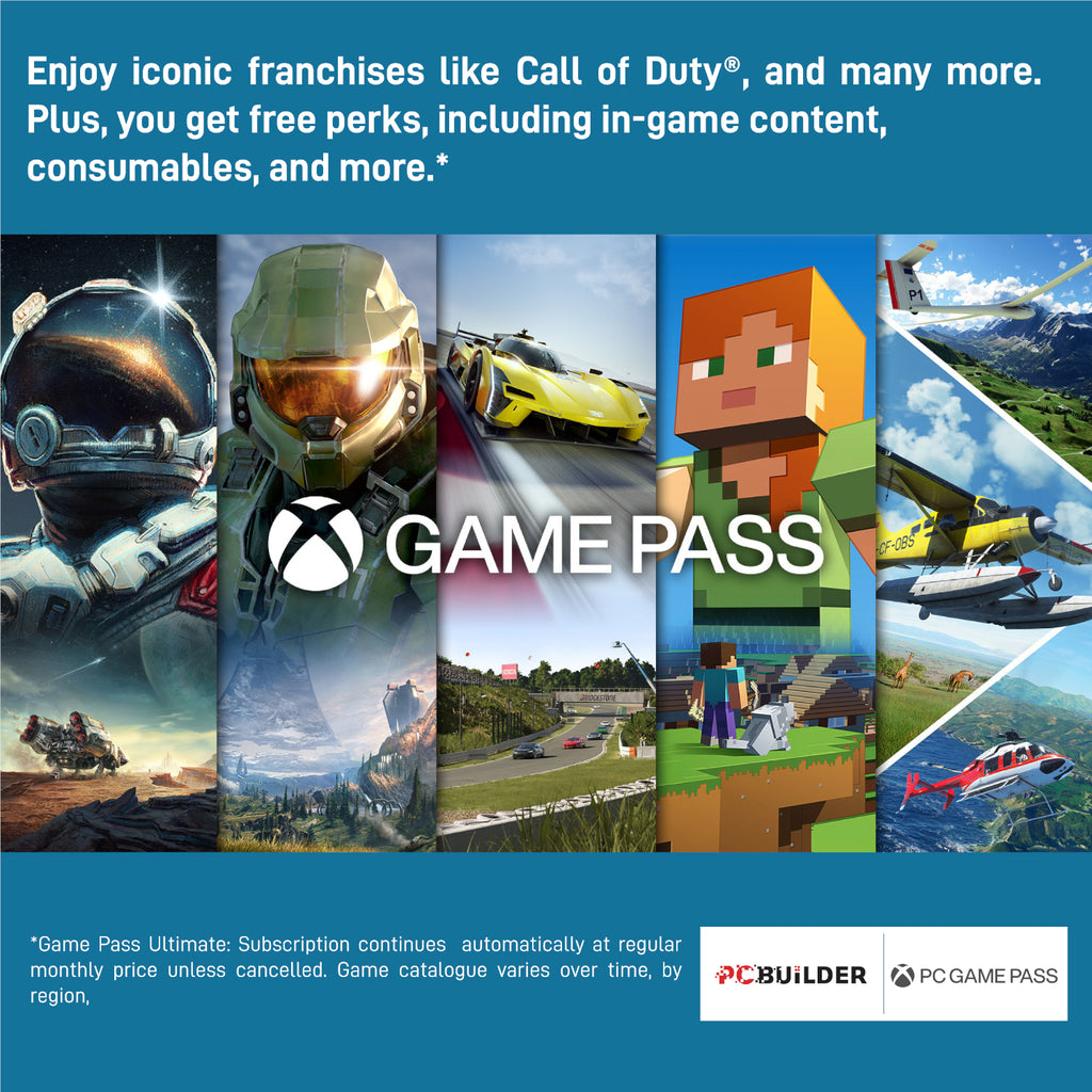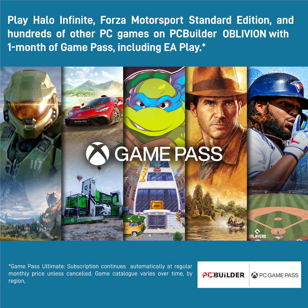 The PCBuilder OBLIVION Windows 11 Gaming PC also includes one month of PC Game Pass including EA Play. Play over 100 high-quality PC games, in various genres such as Halo Infinite, Forza Horizon 5, and Minecraft on your new gaming rig. With new games added all the time, there’s always something new to play from day one.