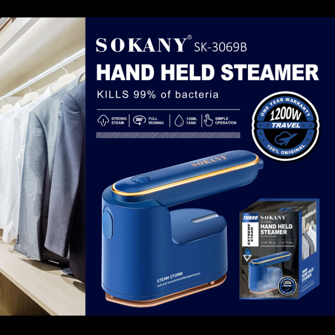 The Sokany SK3069B Handheld Steamer in blue delivers powerful 1200W performance with a 25ML water tank for strong, continuous steam that effortlessly removes wrinkles. Its compact design offers full ironing capability and simple operation, making it perfect for quick touch-ups at home or on the go. Lightweight and efficient, it ensures smooth, crisp garments anytime, anywhere.