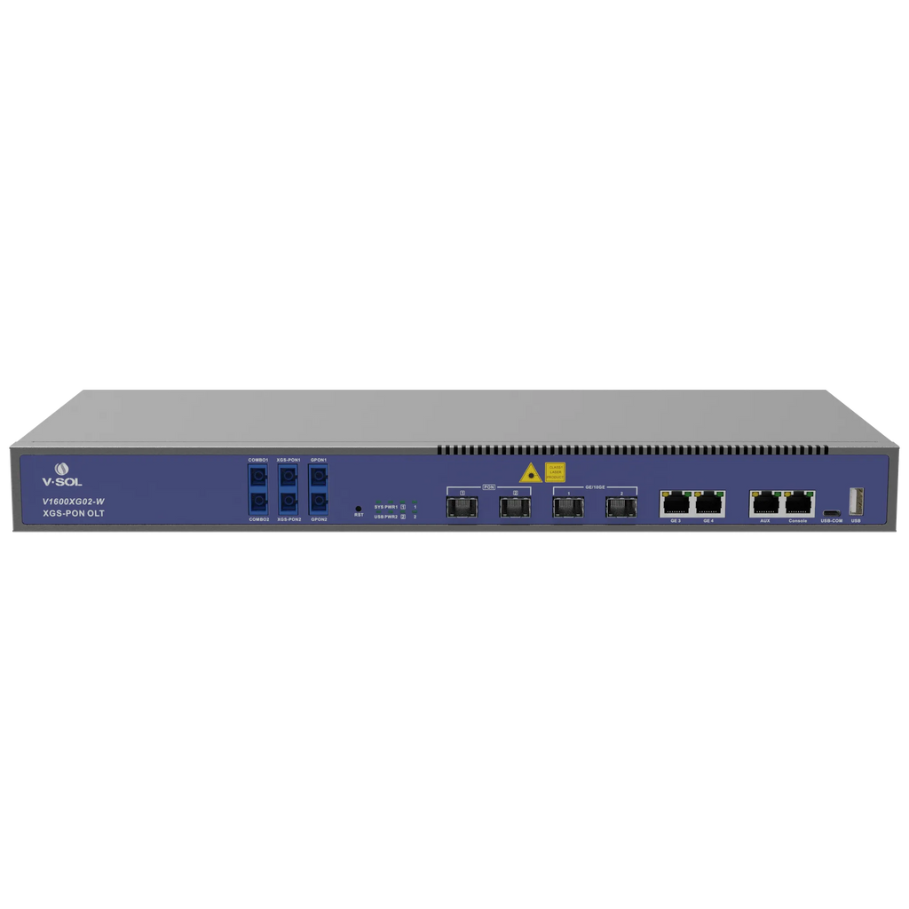 The VSOL V1600XG02-W is a 2-port Optical Line Terminal (OLT) designed for high-performance fibre-to-the-premises (FTTP) networks. It provides two XG/XGS-PON ports, supporting both asymmetric XG-PON and symmetric XGS-PON (10G/10G) capabilities. With a high splitting ratio of up to 1:256, this OLT can serve a large number of subscribers efficiently. The integrated WDM (Wavelength Division Multiplexing) allows for the coexistence of multiple PON services on the same fibre infrastructure, simplifying network upgrades. For high-speed connectivity, it includes two 25GE/10GE SFP28/SFP+ ports and two 10GE/GE SFP+/SFP uplink ports. The device supports multiple management methods, including WEB, CLI, Telnet, and SNMP for flexible administration. Its compact 1U design is suitable for standard rack installation, making it an effective solution for ISPs and network operators building high-speed fibre access networks.