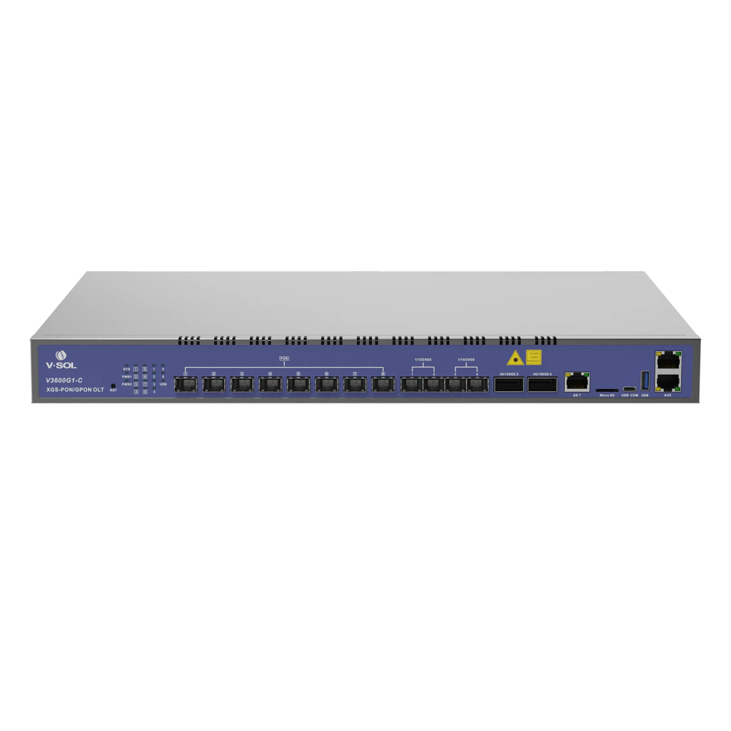The VSOL V3600G1-C is a high-density, 1U rack-mountable Optical Line Terminal (OLT) designed for scalable Fibre-to-the-Home (FTTH) and enterprise networks. It provides a flexible and high-capacity solution for Internet Service Providers (ISPs) building or upgrading their fibre infrastructure. This OLT is equipped with 8 combo PON ports, which allow simultaneous support for GPON, XG-PON, and XGS-PON technologies on the same physical port. This feature enables a direct migration path from lower speed to 10G symmetrical services without requiring hardware replacement. For high-speed aggregation, the unit includes 4 x 25GE SFP28 and 4 x 10GE SFP+ uplink ports. Additional specifications include a 520 Gbps switching capacity, Layer 3 routing functions, and dual, hot-swappable power supply slots for operational redundancy. The V3600G1-C is a functional choice for constructing dependable, high-speed fibre access networks.